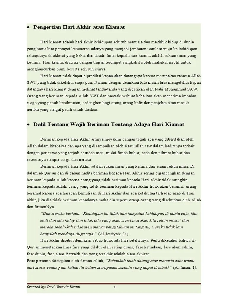Kubur, dan apa yang terjadi sesudah itu seperti. Siswa dapat menjelaskan pengertian hari akhir. Beriman kepada hari akhir atau hari kiamat merupakan rukun iman yang kelima. Kalimat kiamat di dalam bahasa indonesia adalah hari kehancuran dunia, kata ini diserap dari bahasa arab yaum al qiyamah, yang arti sebenarnya adalah hari . Menjelaskan pengertian hari akhir, dan pengertian beriman kepada hari akhir.